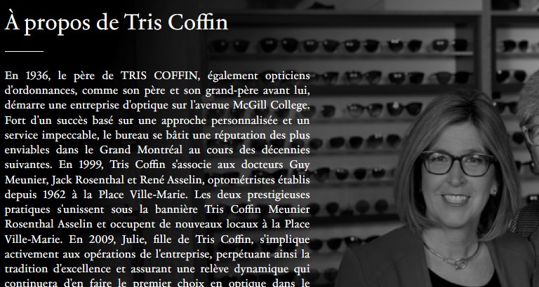 TRIS COFFIN vous offre des services complets en optométrie, des équipements à la fine pointe de la technologie, un choix multiple de montures de marques prestigieuses, des opticiens et conseillers passionnés par la mode optique et des experts en lentilles cornéennes.